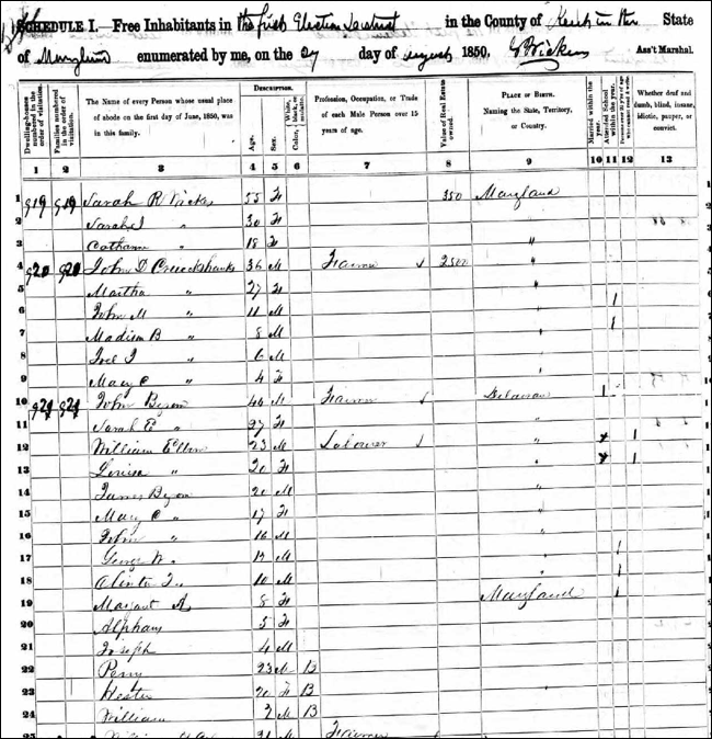 Millicent had 4 children between 1810 and 1830. This Deed of Mortgage was recorded on 14 Mar 1845 showing Millicent living with her son Thomas W. Elbern and his wife Sarah, her son Edward, her daughters Mary Ann and Sarah Eliz II, and Thomas Walker. Thomas Walker is listed in the 1850 census of District 3, Kent Co., MD, as born in 1794 in Maryland, living alone; he was 56 years old and a very wealthy merchant.