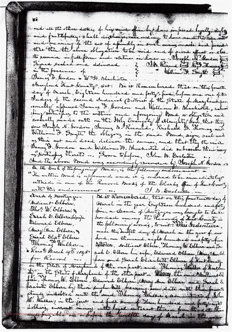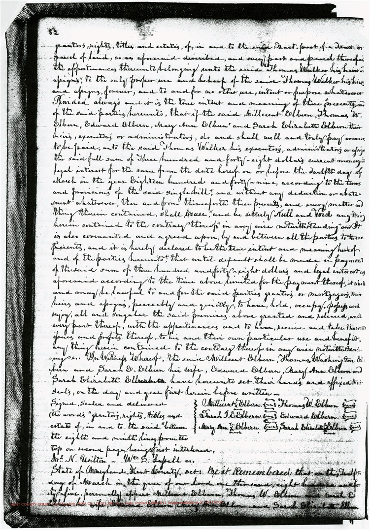 1845 Mar 12 -- Deed of Mortgage Millicent Elbern to Thos. Walker. 142 acre tract in Quaker Neck formerly sold to Samuel Elbern 26 Sep 1837, Jng Liber 10 Folio 80. Samuel died intestate and the estate descended to Thomas Washington Elbern (his son – this is one of the only times we see his middle initial W. stands for Washington, p. 82 toward the bottom on the right-hand side just above the signatures) & Sarah E., his wife; Edward, Mary Ann, Sarah Elizabeth Elbern and others, his children and heirs at law, subject to the dower of Millicent Elbern. This Deed of Mortgage states that Thomas W. Elburn was the son of Samuel Elburn and his wife, Millicent. The Deed also reveals siblings of Thomas: Mary Ann Elburn, Edward Elburn who m. Sarah Ann Hall, Sarah Elizabeth Elburn who married John Byron, William Elburn, and Millicent Louisa Elburn who married James R. Chambers. It states