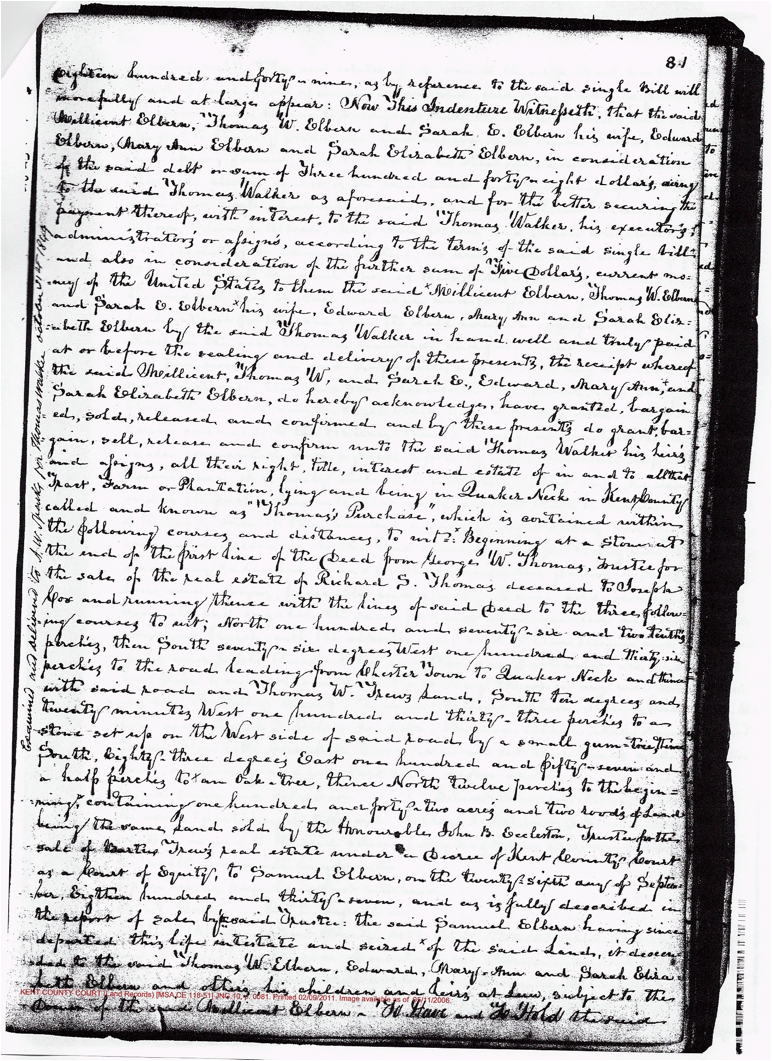 á 26 Sep 1837, Samuel Elburn bought ThomasŐs Purchase, conveyed by the honorable John B. Eccleston, Trustee for Bartus Trew. Note: The original patent was for 1000 acres; under ownership of the Thomas Family, it grew to 1080 acres, then it seems to have been parceled – the parcel Samuel bought was 142 acres. Other deeds for parts of ThomasŐs Purchase that sold by the Thomas and Trew families to others exist. Thus, the Samuel Elburn land was a portion of the original Kedgerton, resurveyed as ThomasŐs Purchase. As for Millicent, SamuelŐs wife, signing over administration of SamuelŐs estate to Thomas Walker, an exact same signing over of administration to Thomas Walker was made, signed, and sealed by son Thomas W. Elburn directly after MillicentŐs page, which probably means that Millicent had originally wanted her son Thomas to administrate his fatherŐs estate, but Thomas preferred assigning trusteeship to Walker. As for the census, Walker was a neighbor. Some of the deeds refer to the parcel as being bordered by the land of Thomas Walker.