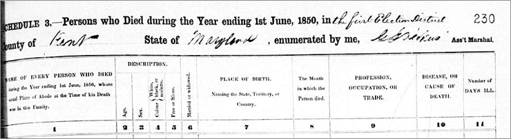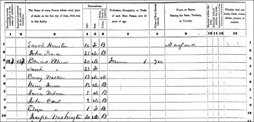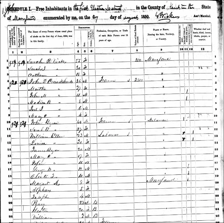 Note: The following 1850 census states the birth state as Delaware, but this must be an error as the 1860, 1870, and 1880 census records all state they were born in Maryland.