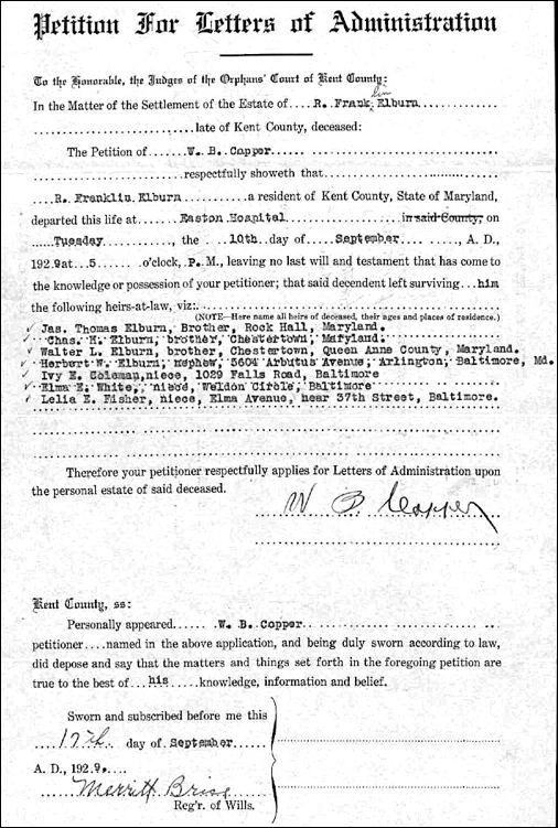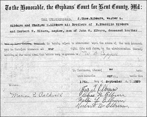 Richard Franklin ElburnÕs mother, Mary Elizabeth Deford Elburn, died in 1907. He was her last child. At that time, Richard was 29 years old. The website https://familysearch.org/ has 47 pages from the OrphansÕ Court for or before the Register of Wills for Kent County, Maryland, the estate of R. Franklin Elburn, dated 9/10/1929. Listed as sureties are W. B. Copper, James Thomas Elburn, Chas. H. Elburn, Walter L. Elburn of Kent Co., MD, and Herbert W. Elburn of Baltimore, MD. Following is page 7 of 47 which has some genealogical data. Richard Franklin ElburnÕs brother John William Elburn died in 1912; inheritance was given to his children Herbert, Ivy, Lelia, and Elma.