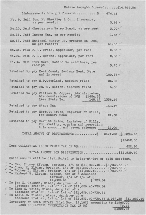 The following estate papers for Richard Franklin Elburn is 47 pages and can be found on FamilySearch.org. The administrator of his account was W. (William) B. Copper, with his brothers James Thomas Elburn, Chas. H. Elburn, and Walter L. Elburn of Kent Co., MD, and his nephew Herbert W. Elburn of Baltimore, son of his deceased brother John W. Elburn, as sureties. Page 1 or 47: