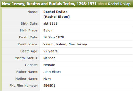 1870 Sep 16 -- Rachel died in Salem, Salem County, NJ, age 52.