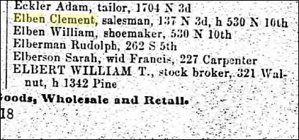 1861 City Directory of Philadelphia, PA, when Clement was 23 years old. Also listed is his father.