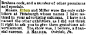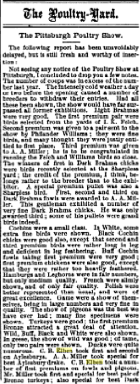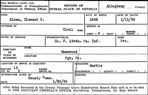Clement m. Nannie F. McMaster on 21 Dec 1864 in the First Presbyterian Church of Pittsburg, PA. She was b. in 1842, d. 1914. Both are buried at the Homewood Cemetery in Pittsburg, which has over 73,000 interments. Other Elben families moved from this area westward into Ohio. No known heirs.