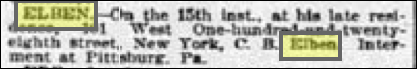 Clement died at age 57 on 15 Jan 1895 in NY, NY, and was buried at the Homewood Cemetery on Dallas Ave. in Pittsburg, Allegheny Co., PA, which is located in the Squirrel Hill Section of Pittsburgh. He is in Section 13, Lot 3, Grave 1. Another Clement Elben was buried at the Spring Hill Cemetery, North & Hanson, Easton, MD. Nannie R. McMaster Elben died in 1914 and is also buried at the Homewood Cemetery.