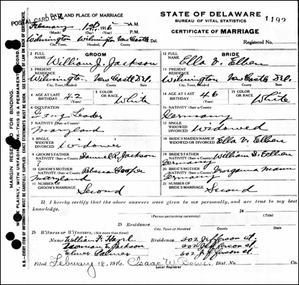 Wilson registered for WWI Draft at age 42 on 12 Sep 1918 when he was a machinist living at 613 E. 11th St., Wilmington, DE.