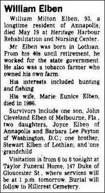 9.1* William Milton Elben, b. 5 Feb 1907 in Chapel, Talbot Co., MD, d. 19-22 May 2000 in Annapolis, Anne Arundel Co., MD, at age 93. He m. Marie Eunice Edeler who was b. 1910. Marie Edeler Elben was b. 1910 in Maryland. They had daughter Barbarra L. and son John C. At one time he lived at Ainview Ave., Edgewater, MD.