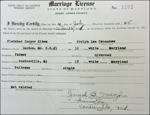 Fletcher m2. Evelyn Lee Cronshaw on 14 Jul 1945. She was b. 24 Apr 1920, d. 13 Jan 2006 in Denton, Caroline Co., MD. She was the dau. of James and Rosa Cronshaw.