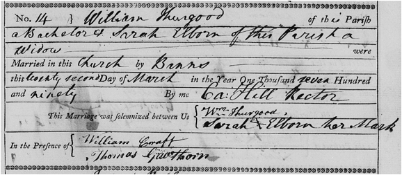 She remained in Baldock and shows intent on marrying William Thurgood on 1 Nov 1789 in Baldock. Just 4 months later, the marriage was recorded on 22 Mar 1790 in the same parish in Baldock, Hertfordshire, England, at age 35. This document states that Sarah Elborn was a widow. She could not write, but William could. Her first marriage to Elborn occurred between 1770-1790, which also means that he must have died between 1770-1790. A burial exists for William Elborn on 12 Dec 1788 in Baldock, which states he was a labourer and does not give the name of his wife or father.