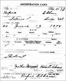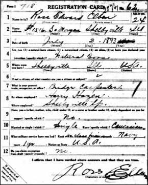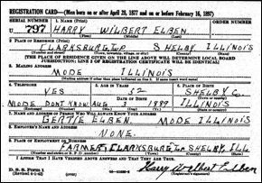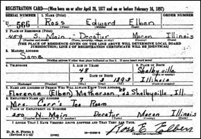 7.7* Ross Edward Elben, b. 3 Jul 1893 in Shelbyville, Shelby Co., IL. Ross is listed in the 1900 census of Shelbyville, Shelby Co., IL, living with his parents. In the 1910 census of Terre Haute, Vigo Co., IN, he is living with his parents. In the 1920 census of Terre Haute, Vigo Co., IN, Ross is married to Geneive, same age, and living with their son Orbit E. Elben. Ross d. in 1965 in Vigo, IN. Below are the WWI and WWII Draft Registration Cards. He was medium height and weight, blue eyes and brown hair. He was a bridge carpenter employed by Harry Hazen in Shelbyville. In 1920 he lived at 337 N. 15th St. in Terre Haute, IN, and was a machine operator. In 1922 he lived at 337 N. 15th St. in Terre Haute, IN, and was a fieldman. In 1924 and 1925 he was a driver in Terre Haute, IN.