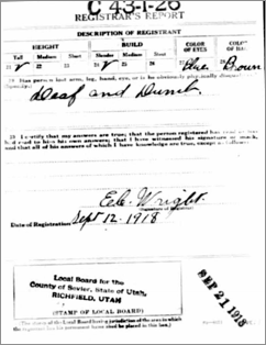 7.1 Rufus Elben, b. 13 Jun 1898 in Salina, Sevier Co., UT, m. Lucille May Crow on 20 Jun 1925 in Salt Lake City, UT, d. 25 Jun 1976 in Salt Lake City, UT. Had 3 daughters Laurel Doreen, Darlene, and Marjorie who are listed in the 1940 census of Salt Lake City living at 326 South 7th East Street. In the 1930 census of Salt Lake City, Rufus states that he was born in Utah and that his father was born in Michigan and his mother in Utah; however, the 1900 census of Salina, Sevier Co., UT, when Rufus was merely 1 year old, states that his father was born in Indiana and his mother Maggie in Minnesota. In the 1920 census of Salina, Sevier Co., UT, Rufus was living with his parents, Ernest and Maggie Elben, and with his sisters Ruth, Helen, Laurel, and Laura. Rufus registered for WWI when he was 20 years old and a student; he was tall, slender, had blue eyes and brown hair, and was deaf and dumb. In the 1940 census of Salt Lake City, Salt Lake Co. UH, Rufus lived at 326 South 7th East Street with his wife Lucille and their 3 daughters Laurel 18, Darlene 12, and Marjorie 4.