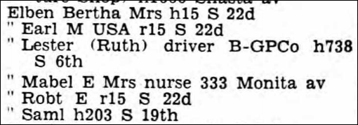 7.9 Lester Elben, b. 15 Nov 1903 in Lewiston, Nez Perce Co., Nez Perce Co., ID, d. 11 Jun 1974 in San Jose, CA. He m. Ruth Marie Luhrdorf on 7 Oct 1938 and had daughter Donna Elben. His widow Ruth was born on 19 Nov 1909 and passed away on Aug 17, 1987 in San Jose, Santa Clara County, California, age 77. He lived in Weippe, Nez Perce Co., ID in the 1910 census with his parents and siblings. He lived in Gifford, Nez Perce Co., ID in the 1920 census with his parents and siblings; he was 18. In 1943 Lester was living at 738 S. 6th St. in San Jose, CA, and worked as a driver (see directory below).
