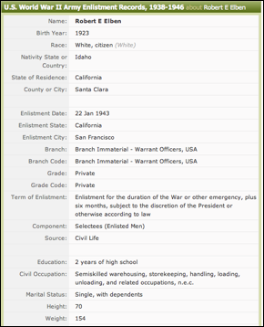 Earl M. Elben World War II Army Enlistment (#1694370). Name: Elben, Earl M. Serial Number: 19012004. Residence: Santa Clara, California. Enlistment Place: Ft Mcdowell Angel Island, California. Enlistment Date: 01 July 1940. Grade Alpha: Pvt. Grade Code: Private. Branch Alpha: Ce. Branch Code: 83. Enlistment Term: Enlistment For The Philippine Department. Longevity: Source: Civil Life. Nativity: Idaho. Birth Year: 1920. Race and Citizenship: White, Citizen. Education: 4 Years of High School. Civil Occupation: Occupations In Manufacture of Automobiles, N.E.C. Marital Status: Single, Without Dependents. Army Component: Regular Army (Including Officers, Nurses, Warrant Officers, and Enlisted Men). Card Number: Box Number: 0299. Reel Number: 3.21