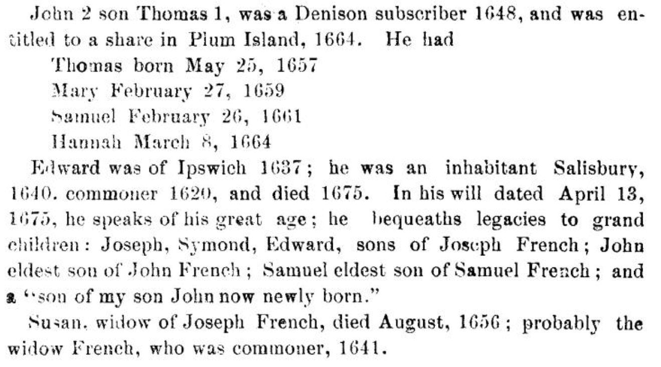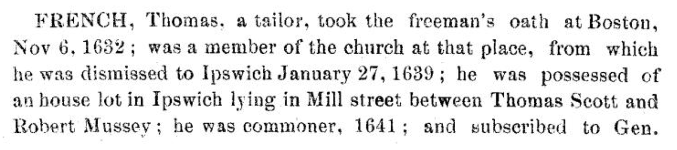 Thomas French was born in 1584 in Bures St. Mary next to Assington, County Suffolk, England. Thomas m. Susan Riddlesdale 5 Sep 1608 in Assington. Susan was b. 20 Apr 1584 at Boxford, Suffolk Co., England, dau. of John and Dorcas Riddlesdale, d. Aug 1658. Thomas d. 5 Nov 1639 in Ipswich. Both Thomas and Susan emigrated in 1635 to Ipswich, five years after their son, Thomas French Jr., born ca. 1608, d. 8 Aug 1680 in Ipswich, Essex, MA, who emigrated from Assington, County Suffolk, England, to Ipswich, MA in 1630. Thomas French Jr, m. Mary Scudamore born approx 1612 in Gloucester, England and d. 6 May 1681 Ipswich, Essex, MA. Thomas lived on Bridge St. near Mill St. in Ipswich, MA. He also owned land on Plum Island which is now a State Park.