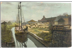 The Wharf, Weymouth, MA (old postcard), Schooner at Rhines Lumber Yard, Weymouth Land. At Weymouth Landing, a substantial number of wharfs lined the shores of the Monatiquot River, the area now generally called the Fore River. Image provided by Jodi Purdy-Quinian, Vice Chairman of the Weymouth Historical Commission