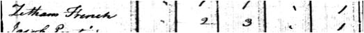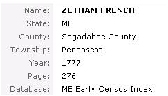Per the 1840 Census for Prospect, Waldo County, Maine, Zetham French (JR?) household included 1 male age 10-14; 1 male age 15-19, 2 males age 20-29, 1 male 40-49 and 1 male 50-59. Women in the household were 1 child under age 5, one girl 5-9, 2 females 19-29 and 1 wom an 50-59.