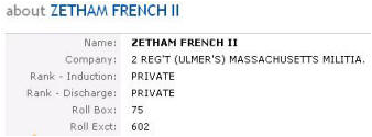 Per the war records of 1812, Zetham French II is listed as serving in the Massachusetts Militia as a private.