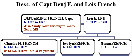 *CAPTAIN BENJAMIN F. FRENCH was born in 1825. Parents are currently not known to me In the 1850 Census for Prospect, Maine, Benjamin is listed as a 25 year old "sailor." He married LOIS E. LNU who was born two years later in 1827. Capt. French died April 29, 1860 but his widow lived another 40 years, passing away at the turn of the century, 1900. Captain French is buried at the Sandy Point Cemetery in Sandy Point, ME.