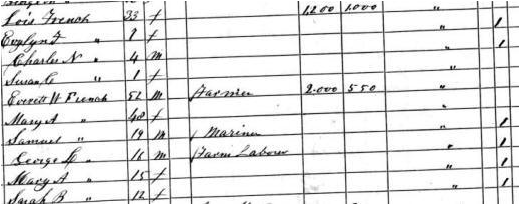 As seen in the 1860 Census shown under Capt. Benjamin French, living next door to Lois and the kids is an EVERETT H. FRENCH and his family. Everett is listed a 52-year old farmer born in approximately 1808 (not the Everett listed in the family bible). His wife is Mary A, who is 48 years old (born about 1812). They have a son SAMUEL FRENCH, who is 19-year old Mariner, born about 1841 (does not match any listed in the family bible), George L. French, who is 16-year old farm laborer (born about 1844), Mary A. French who is 15 (born about 1845) and Sarah B. French who is 12 (born about 1848).