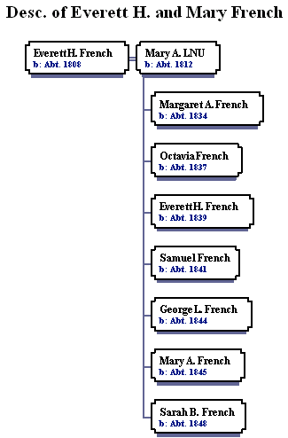 In the 1850 Census, EVERETT FRENCH, a sailor, born about 1808 is listed as living in Prospect Maine with his wife, Mary A., age 31, and, I am assuming, children. The first child is Margaret A. who is 15, meaning that Mary had her when she was abut 16. Then came Octavia (about 1837) followed by EVERETT FRENCH (Jr.?) born about 1839. Samuel, George L, Mary A. and Sarah B. are the last children known born to this couple.