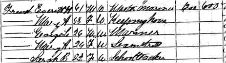 In the 1870 Census for Stockton Maine, Everett is now 61, Mary A. is 58, and their children George (a 26 year old Mariner), Mary (a 24 year old Seamstress), and Sarah (a 23 year old school teacher) are all still living at home with their parents.