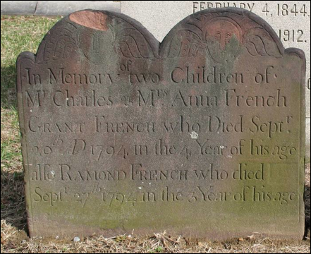 5.33 Grant French, b. 13 Oct 1790 in Seymour, d. 29 Sep 1794 age 4 [6] [7] [20]. He and his brother were buried at the Seymour Union Cemetery in Seymour, New Haven Co., CT, at 115 Derby Ave.