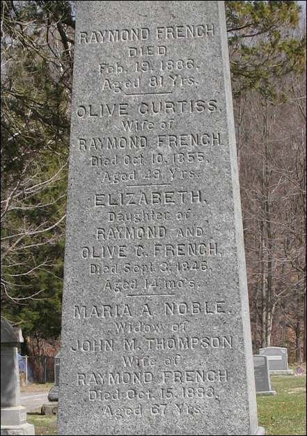 5.40* Raymond French, b. 7 Jan 1805 in Seymour, d. 19 Feb 1886, m1. 11 Dec 1833 Olive Curtis, m2. Mar 1857 Maria A. Noble [6] [20].