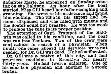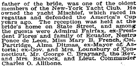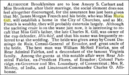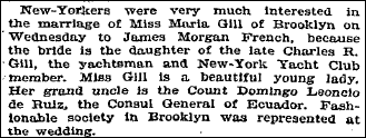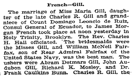 James m. Maria Gill, dau. of Dr. Charles R. Gill and Delores Ponce de Leon, of Cuba, on 18 Oct 1893, by Ref. Charles Hall of the Holy Trinity Church in Brooklyn, NY [61]. The article below is from The New York Times, October 19, 1893.
