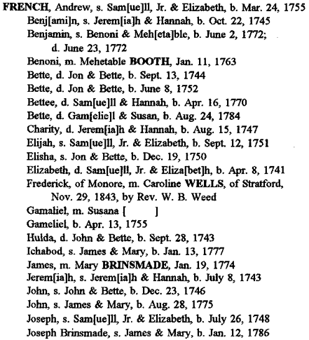 [2] New England Historical & Genealogical Register, July 1893 (vol. 47) page 357-361. Website: http://books.google.com/books?id=2rkEg7BFm3YC&pg=PA361&dq=%22John+French%22&lr=lang_en&as_brr=0&as_pt=ALLTYPES. See screen capture in Records.