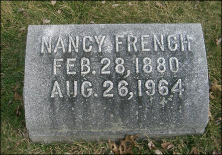 [65] Nancy French of Mt. Sterling, Montgomery Co., KY, born 28 Feb 1880, d. 26 Aug 1964, buried at Machpelah Cemetery in Mount Sterling, Montgomery Co., KY. Relationship unknown.