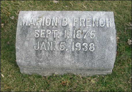 [66] Marion B. French of Mt. Sterling, Montgomery Co., KY, born 1 Sep 1875, d. 5 Jan 1938, buried at Machpelah Cemetery in Mount Sterling, Montgomery Co., KY. Marion was married to Nancy French. Relationship unknown.