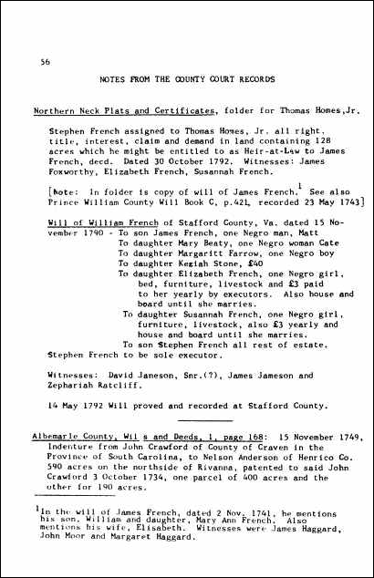 v. RENOE includes the lost will of William FRENCH (1792, Stafford County), and