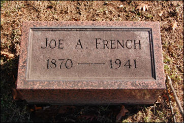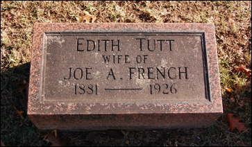 7.7 Joseph A. French, b. 1870 in KY, d. 1941 and is buried at the Frankfort Cemetery in Frankfort, Franklin Co., KY. He served as his fatherÕs executor. It is said that he dropped dead on Elkhorn Creek bank [18] in 1941. He m. Emma or Edith Tutt, 1881-1926, no heirs [18]. Edith was b. May 1881 in KY, the dau. of William J. and Kate M. (Hodges) Tutt, both born in Kentucky. She is listed in the 1900 census of Eminence, Henry Co., KY, living with her parents and siblings, and is single.