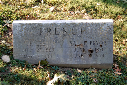 7.14* Robert Lee French, b. 27 Jul 1863, d. 13 May 1934 in Franklin Co., KY, m. Sarah Head Pryor, dau. of Dr. Green Lewis Pryor and Martha Ann Head in Monterey, KY, on 12 Oct 1892. They had 2 daughters: Harriet Pryor French who m. William Whitley Moore; and Alice Lee French, m. James Lister Darlington [18]. Sally was b. 4 Jun 1871, d. 29 Jun 1954. Both are buried at the Frankfort Cemetery in Frankfort, Franklin Co., KY.