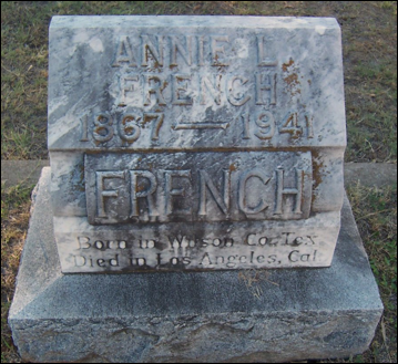 Annie L. French was buried in 1941 at the Oakwood Cemetery in Fort Worth, Tarrant Co., TX
