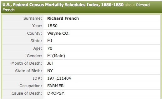 2.3* Richard French, b. 1816 in NY, was living near his brother Levi in the 1860 census of Exeter, Monroe Co., MI, age 44, with his wife Alvira Berry age 43, and their 5 children. He appears in the 1880 census of Ovid, Clinton Co., MI, age 63, laborer, living with Maggie French age 5.