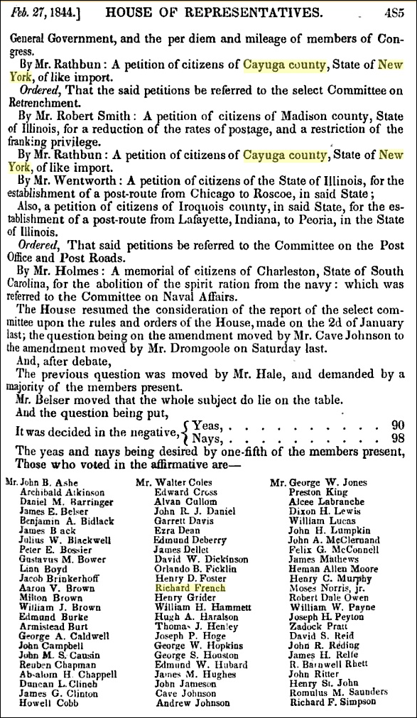 Richard French was living in Cayuga County, NY, in 1844 when he voted in the House of Representatives, from the Journal of The House of Representatives of The United States being the First Session of the twenty-eighth congress, begun and held at the City of Washington, 4 Dec 1843, copyrighted 1844. RichardÕs name shows on 84 pages. He is the only French listed in this book.