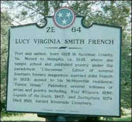 Lucy Virginia Smith French was born 1825 in Accomac Co., VA. This marker is located on West Main Street on property where Mrs. FrenchŐs home was. The home is currently owned and occupied by Mr. and Mrs. Steve Smith, 28 Sep 2001.