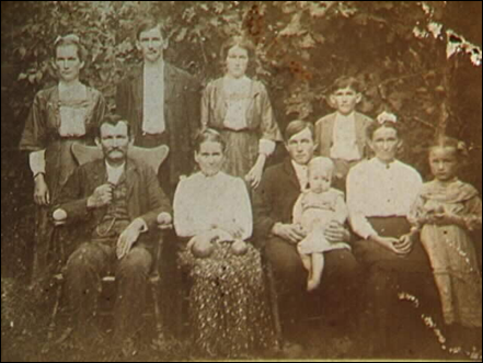Front row: John M. Nash (seated in rocking chair), Margaret Abigail French (his wife), Charles E. Nash holding child, Linnie Williams Nash wife of Charles, Charlene Williams daughter of Linnie (first marriage).