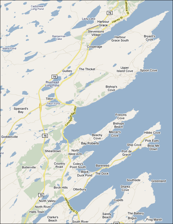 Map of Harbour Grace (to the north) and Bay Roberts, FrenchÕs Cove, ColeyÕs Point, Port de Grave, The Dock, and Bareneed (to the south), homesteads of this French Family