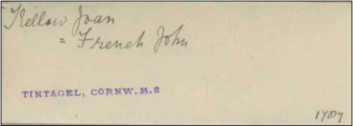 Joan Kellow, was the daughter of William Kellow (1736-1813) and Catherine Bishop (1738-1813). She was christened on 13 Jan 1767 in Tintagel, Cornwall, England, and died on 31 Dec 1836 in Tintagel, Cornwall, England [7]. She was buried 20 Jan 1826 at St. Endellion Church, residence Scarrabine, age 60. The Kellow family is documented back to about 1600 in Cornwall, England. The French family is documented only back to John French, b. 1759. Only 2 of their 9 children immigrated to Canada. See [12] for details.