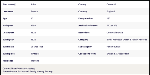 1.1* John French, b. 1759 in Cornwall, England, m. Joan Kellow on 10 Apr 1787 in Tintagel, Cornwall, England, d. 28 Oct 1826 in Tintagel, Cornwall, England at age 67. Residence Trevena, same as Tintagel.