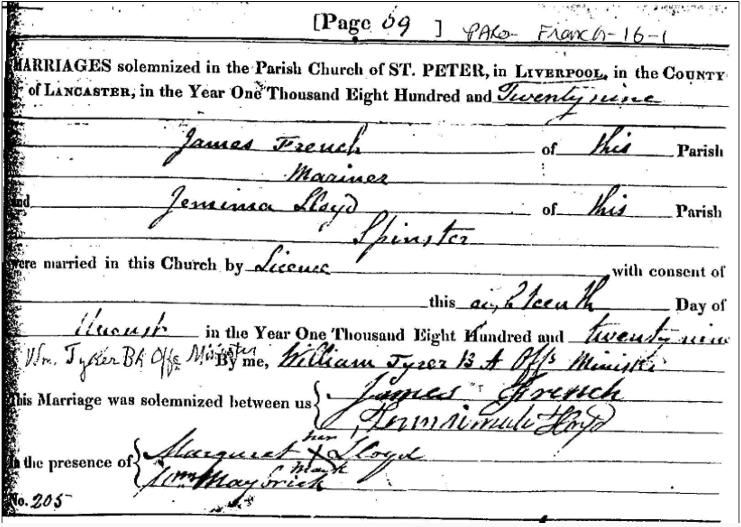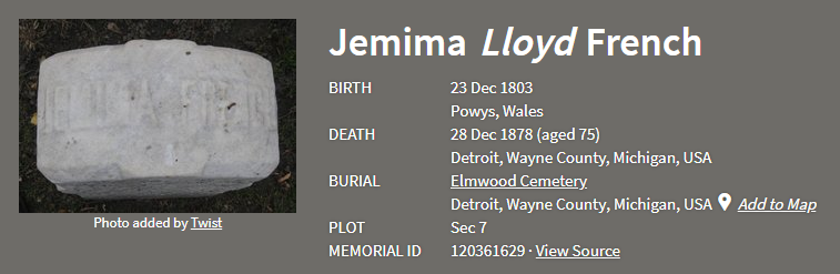 2.2* James Richard French, b. 20 Dec 1803 in Tintagel, Cornwall, England, christened 20 Dec 1803 in Tintagel, Cornwall, England. He m. 18 Aug 1829 [6] in St. Peter’s Church, Liverpool, England to Jemima “Jenny” Lloyd [1] [7]. She was b. 23 Dec 1803 at Caernarvanshire (Powys or Porthlwyd), N. Wales, per her gravestone, the daughter of Richard Lloyd (d. 1845) of Porth Lloyd and Elizabeth Williams Lloyd (d. after 1850). Jemima died on 28 Dec 1878 in Detroit, Wayne, Michigan, USA. See [13] for details.