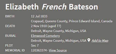 *Elizabeth French Bateson (b. 1833, Crapaud, Prince Edward Island, Canada; m.