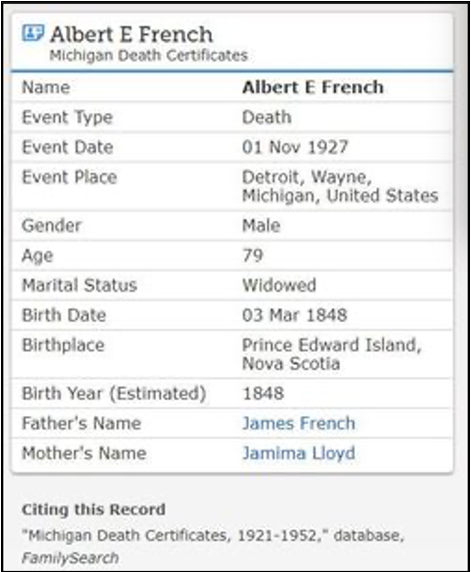 · 16577, Chart #63, James Richard French, b. 1803, Cornwall, England, d. ca. 1850, Prince Edward Island, Canada. James Richard French was born c 1803 in Cornwall, England and died c1850 at Prince Edward Island, Canada. His wife, Jemima Lloyd, was born c1806 at Carnarvavshire, N. Wales and died in 1878 at Detriot, Wayne Co., MI. Their son, Samuel Bateson French, was born in 1850 at Prince Edward Island, CAN and died in there 1885. His wife, Barbara Holm, was born in 1853 at Prince Edward Island, CAN and died there in 1928. Their son, Cyrus Tremaine French, was born in 1879 at Prince Edward Island, CAN and died in 1951 at Eloise, Wayne Co., MI. His wife, Maybelle Pittinger, was born in 1888 at Toledo, OH and died in 1918 Detroit, MI.
