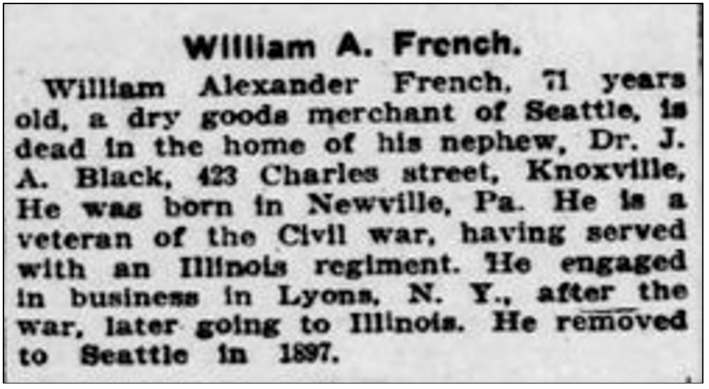 4.1 William Alexander French [11], b. 21 Jan 1840 in Newville, Cumberland, PA, d. 3 Dec 1911 in Knoxville, Allegheny, PA, buried in the Newville Cemetery as the son of Samuel and Elizabeth French [41].