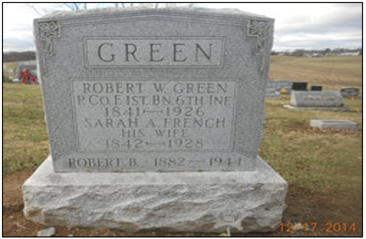 4.2 Sarah Agnes French [11], b. 27 Aug 1842 in PA, d. 11 Nov 1928 aged 86 in Harrisburg, Dauphin, PA, m. Robert Welsh Green (1841-1926). Sarah was buried in the Newville Cemetery in Newville, Cumberland, PA [41]. They had at least 3 children: Clara, George, and Robert who are identified on the cemetery page: https://www.findagrave.com/memorial/139598469/sarah-a-green.