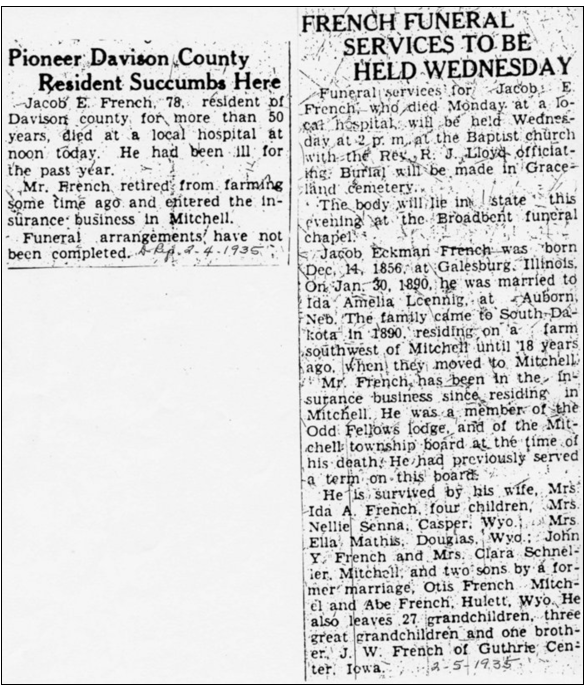 4.12* Jacob Eckman French [11], b. 14 Dec 1856 in Haw Creek, Knox, IL or in Galesburg, IL, d. 4 Feb 1935, aged 78, in Mitchell, Davison Co., SD, and was buried in the Graceland Cemetery in Mitchell, Davison, SD. He was married twice and had at least 10 children [1]. Jacob m1. Levina Holder on 10 Nov 1880 (1858-1887), m2. Ida Amelia Loenning in 1890 (1869-1948) in Auborn, Nebraska and shortly thereafter moved to South Dakota residing on a farm southwest of Mitchell, and then moved to Mitchell. He was in the insurance business, and a member of the Odd Fellows Ledge and of the Mitchell township board. He was survived by 4 children: Mrs. Nellie Senna of Casper, Wyoming, Mrs. Ella Mathis of Douglas, Wyoming, John Y. French, and Mrs. Clara Schneller Mitchell, and two sons by a former marriage: Otis French of Mitchel, SD, and Abe French of Hulett, Wyoming. He also leaves 27 grandchildren, 3 great grandchildren, and 1 brother, J. W. French of Guthrie Center, Iowa – obituary written on 5 Feb 1935.