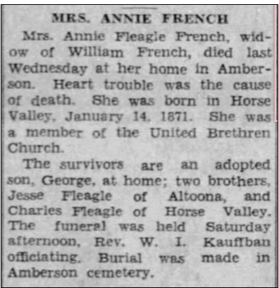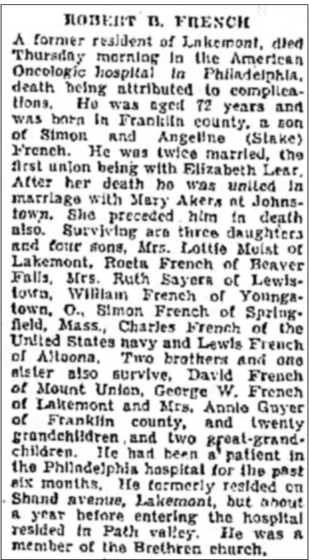 Robert m1. Elizabeth Ellen Lear, b. 1859, d. 1900 only 2 years after their twins were born and Robert had to put the children in an orphanage as he couldn’t take care of them. After Elizabeth’s death, Robert m2. Mary A. Aker who was b. 1872. She preceded him in death also. Surviving are 3 daughters and 4 sons: Mrs. Lottie Moist of Lakemont, Roeta French of Beaver Falls, Mrs. Ruth Sayers of Lewistown, William French of Youngstown, Ohio, Simon French of Springfield, MA, Charles French of the US Navy, and Lewis French of Altoona. Two brothers and one sister also survived after Robert died: David French of Mount Union, and George W. French of Lakemont and Mrs. Annie Guyer of Franklin County, and 20 grandchildren and 2 great-grandchildren. Robert was a member of the Brethren Church. Robert is listed in 1870 census as age 9, living in Fannett, Franklin, PA with his parents and siblings: Mary 13, Barbara 11, Porter 6, David 3, and Clinton 2/12. He was a former resident of Lakemont.